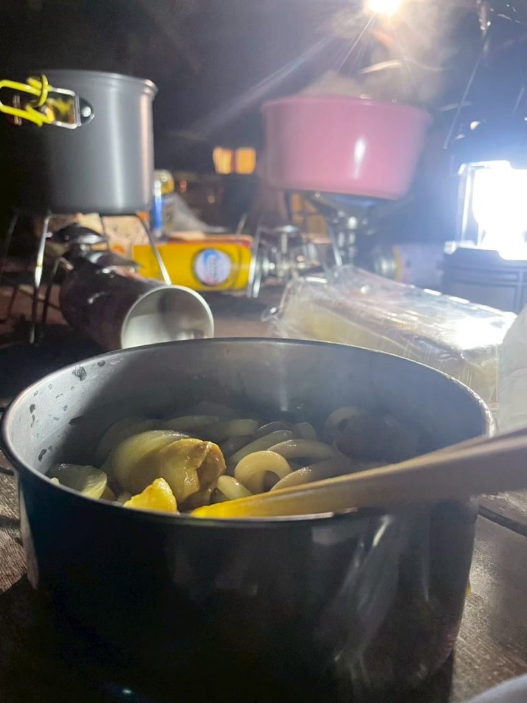 晩ごはんはカレーうどんを作りました。上手にできておいしかったです。1年のワタとカマにとっては初めてのキャンプで、明日に備えてはやく寝ました。