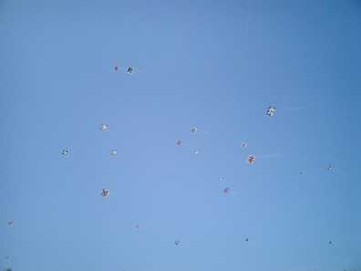 数十のタコが青い空にあがっていました