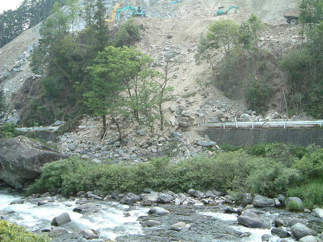 国道256号の向こう側の道路はこんなことに…。