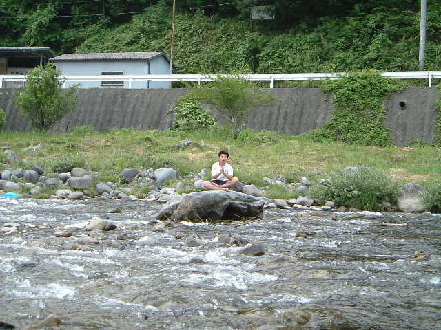 日本最古の石が含まれた岩の上にて。モチーフは原始人と現代人。