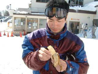 じゃんけんに負けて、自走組が持ってきた冷凍バナナを食べることに・・・