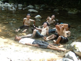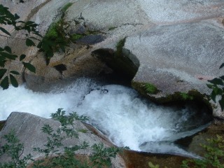 | 神越渓谷。川の流れで岩が削れてます。 | 同じく川越渓谷にて。 実はこの直前に飛田くんが吹っ飛ぶという事件が… |