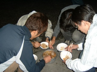 梶屋敷駅にて。ちょっと遅い夕飯です。 いつでも何処でも、もちろん鍋! |