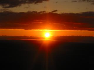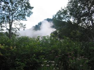 | 開陽台で泊まり、4時半の朝日です。 | もくもくけむり、硫黄のにおいは熊の湯。 |