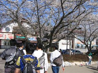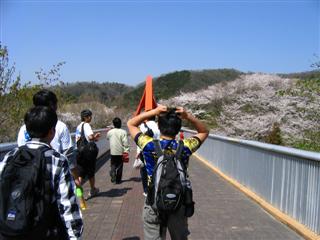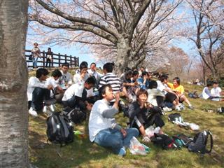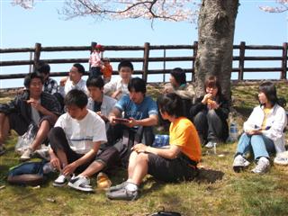 夢のつり橋を渡り、桜満開の木の下へ! 新入生のみなさん、お疲れ様でした♪ |