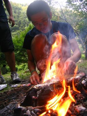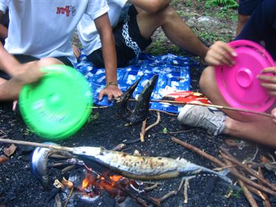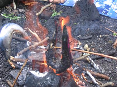 | 串焼きで頑張るキャプテン。。後方にライアンの残骸が・・・ |