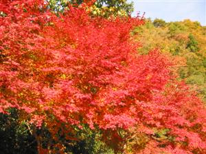 あぁー、もみじがきれー! 黄色と赤が秋の青空に映えるなぁ。 |