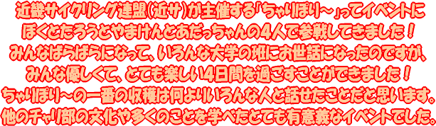 | 僕も和大A班のみんなに、 「チャリ愛」を教えてきました。 いつだってチャリンコと一緒さ! |