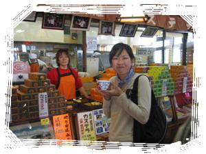 カステラ試食コーナーへ 一目散に駆け込んだ西尾さん。 お茶を飲んだら、もうひと切れヨ♪ |