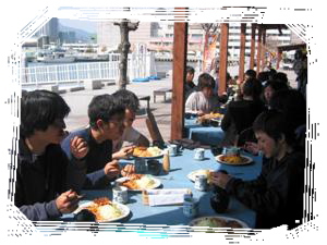 | パールセンターで海の幸! そして、大友氏が西尾さんに おかずをねだられています。 |