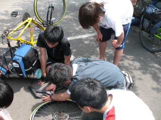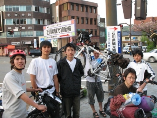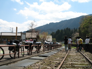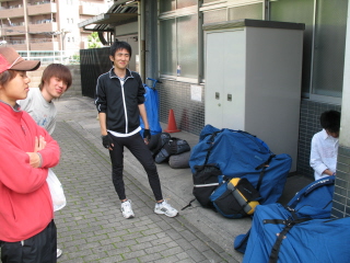 深尾君と深津君が山のように積んで持ってきた 荷物を受け取って輪行準備です。 |
