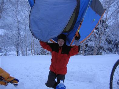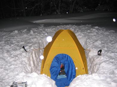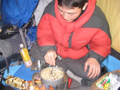 | ▲テント完成 | ▲夜は雑炊だよ |