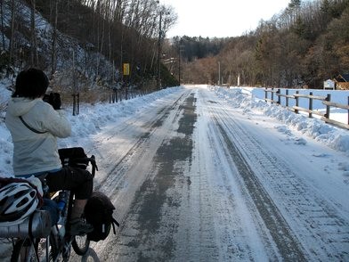 | ▲ずっとこんな道でした | ▲あっ、道路にも雪が! |