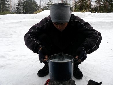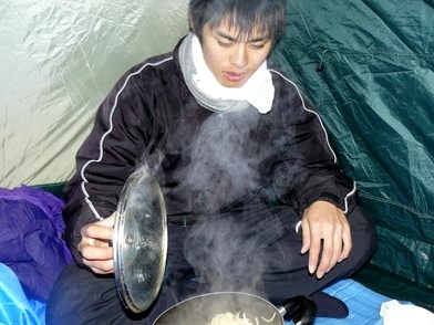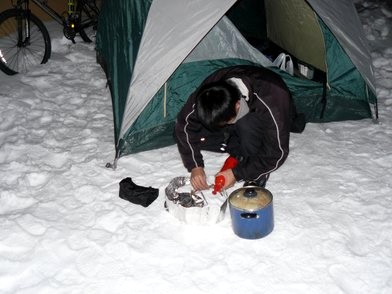 | ▲日没間近の乗鞍。きれいです。 | ▲ガソリンバーナーをセットして |