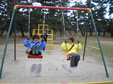 | 浜寺公園に着きました。さぁ、何して遊ぼっか?? とりあえずブランコすることにしました。 みんなブランコ乗るの何年ぶりなんだろね? | ![]() |